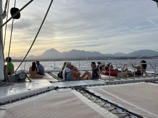 Step aboard a spacious catamaran, enjoy the soothing sea breeze, and witness the sky shift into a stunning display of vibrant colors, creating the ideal setting for a relaxing and awe-inspiring evening.